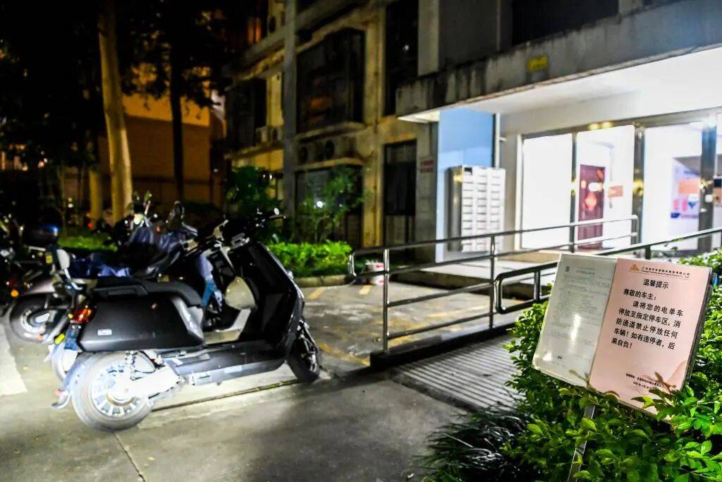 在广西某市一小区,电动自行车将住宅楼门前的消防通道堵塞(9月19日摄)。