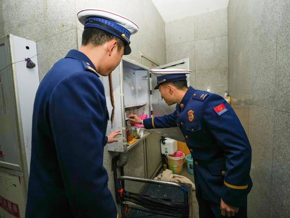 在四川某市一小区,消防人员在检查消火栓器材不全和楼道堆放杂物问题(12月5日摄)。