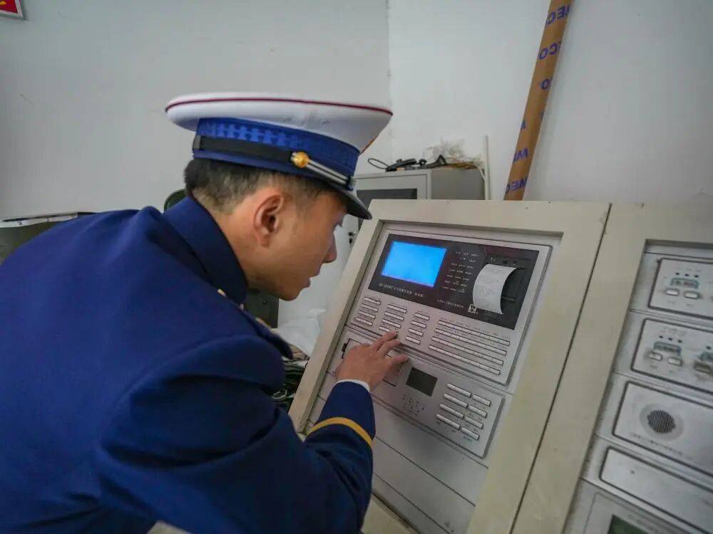 消防人员在四川某市一小区消防控制室检查该小区的联动控制盘失效问题(12月5日摄)。