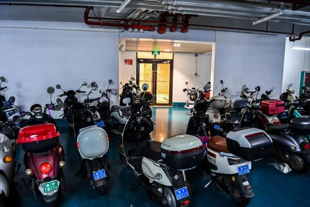 在广西某市一小区,住宅楼入户大厅门前停放着不少电动自行车(9月19日摄)。