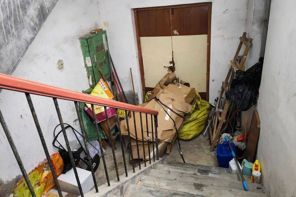 在广西某市一小区,消防楼梯间内堆放着大量杂物,这些杂物将逃生防火门堵住(12月5日摄)。
