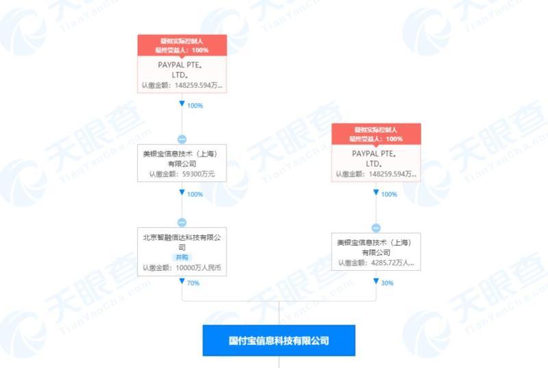 目前,国付宝信息科技有限公司由北京智融信达科技有限公司、美银宝信息技术(上海)有限公司共同持股,而北京智融信达科技有限公司则由美银宝信息技术(上海)有限公司100%持股。公开资料显示,美银宝是海外支付公司PayPal的全资控股公司。该公司成立于2004年8月,注册资本约14.8亿元人民币,由PayPal全资控股。这意味着,国付宝已被PayPal全资控股。