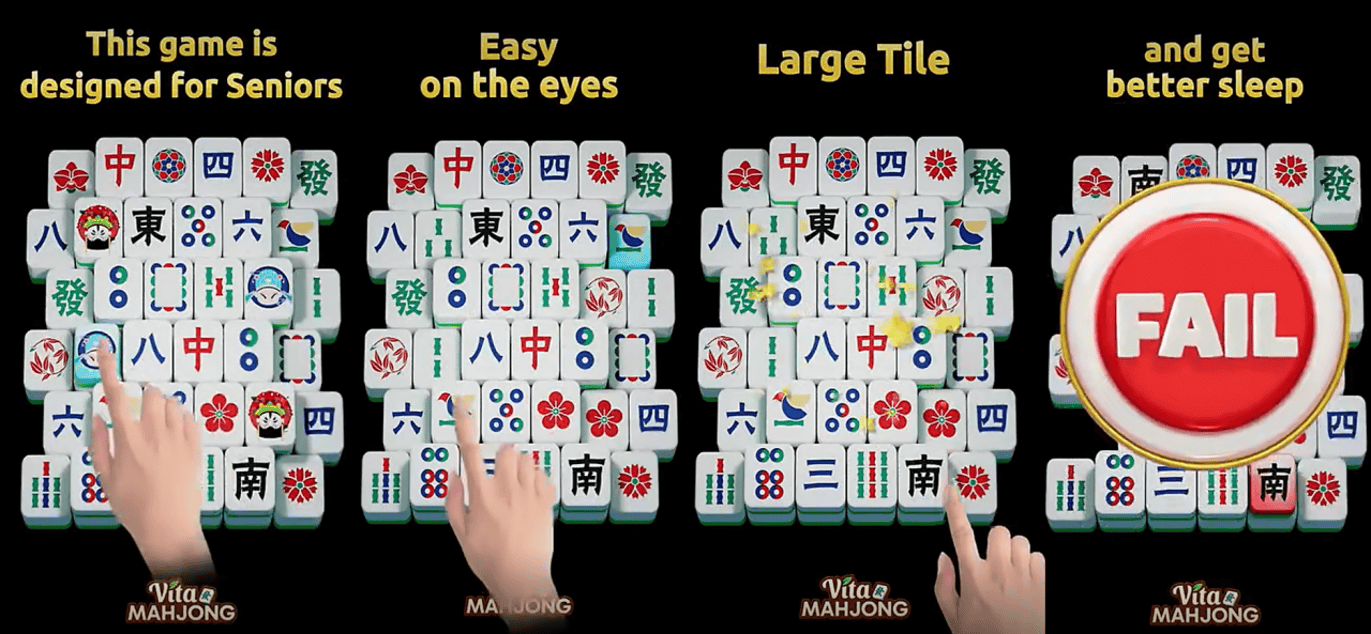 中老年玩家对花哨宣传接受度低,因此买量素材设计多紧扣“易操作、低压力、有价值”三大核心,用简单直接的呈现方式打消其尝试顾虑。例如,《Vita Mahjong》在广告中使用了“no WIFI”和“Free to play”等文案。通过突出游戏的零门槛和无需链接网络的特征,降低了目标受众对技术复杂性的担忧,这种简洁明了的宣传方式还能提升广告的亲和力,增强了他们的尝试欲望。