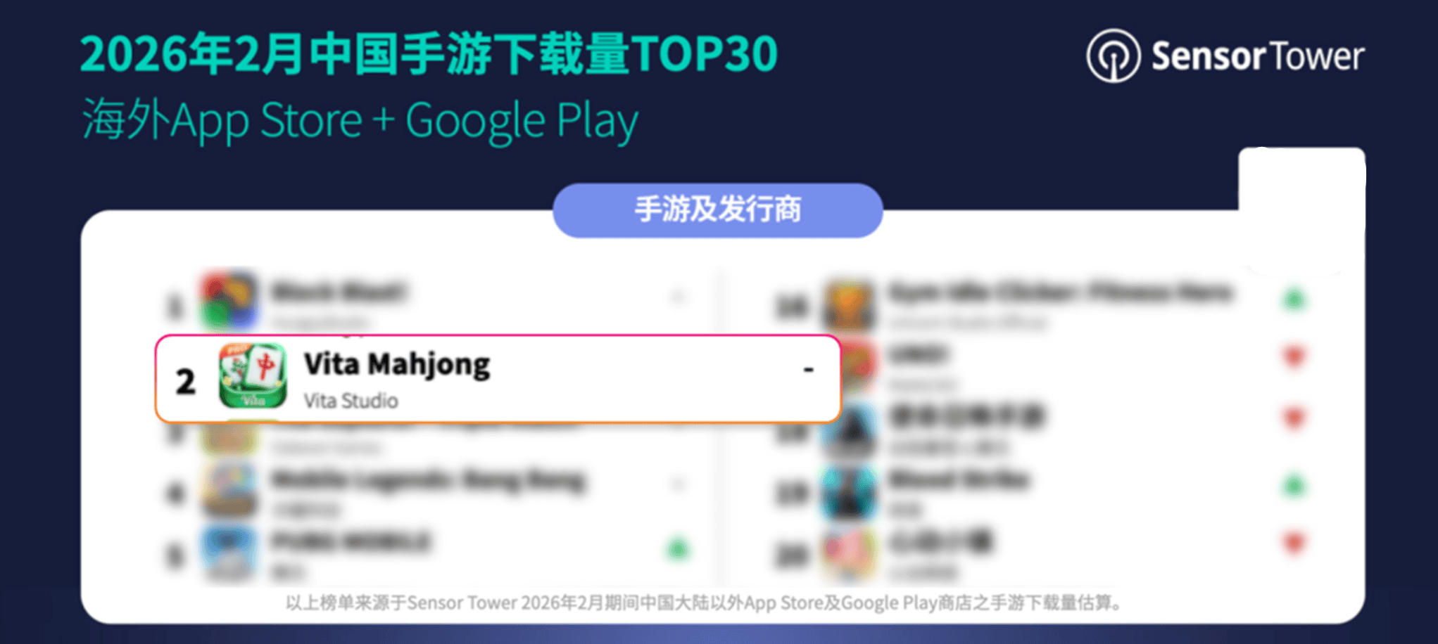 《Vita Mahjong》蝉联2月手游下载榜亚军,数据来源:Sensor Tower