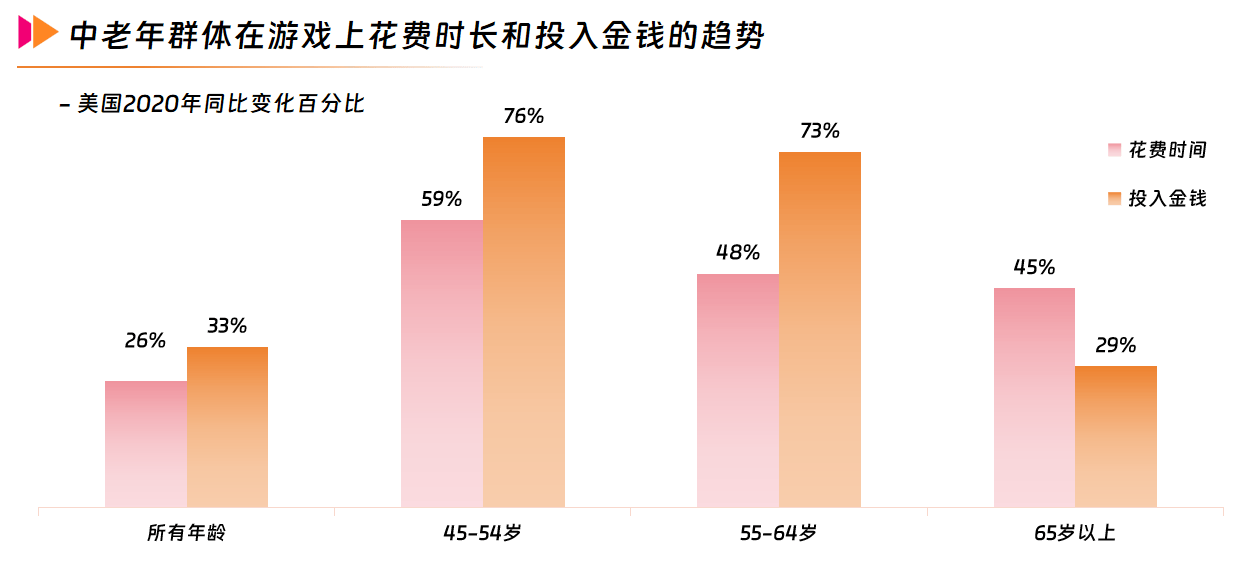 除了游戏时间的增加,消费金额的增长也十分显著。特别是45-54岁(增长76%)和55-64岁(增长73%)年龄段的成年人,他们在游戏上的支出增长速度远高于其他年龄组。65岁以上的人群在游戏上的支出也增长了29%。这些数据验证,中老年玩家不仅在游戏时间上有所增加,更在消费上展现出巨大的潜力。