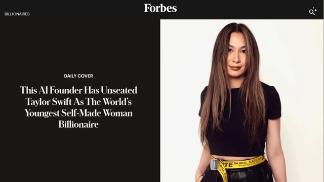 事实上,这不是她第一次登顶。早在2025年福布斯富豪榜上,她就超越流行天后霉霉,成为全球最年轻白手起家女亿万富翁。